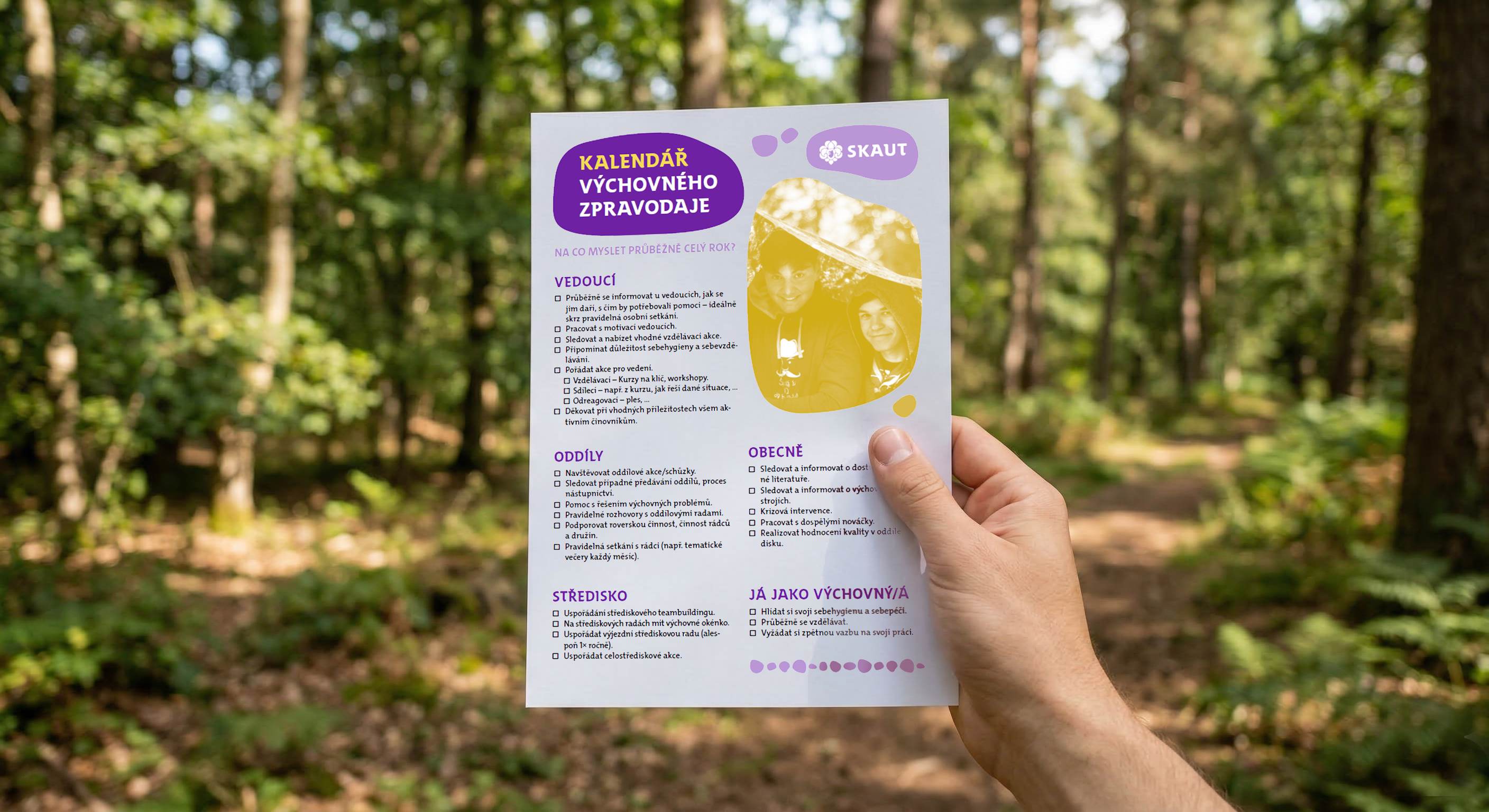 Zároveň v něm najdete konkrétní měsíční tipy, které vám pomohou s plánováním činnosti. V září se můžete zaměřit na zhodnocení táborů a stav oddílů, v dubnu vám kalendář připomene uspořádání střediskového teambuildingu či workshopu a v červnu vás navede k finální kontrole přípravy táborů a školení bezpečnosti.