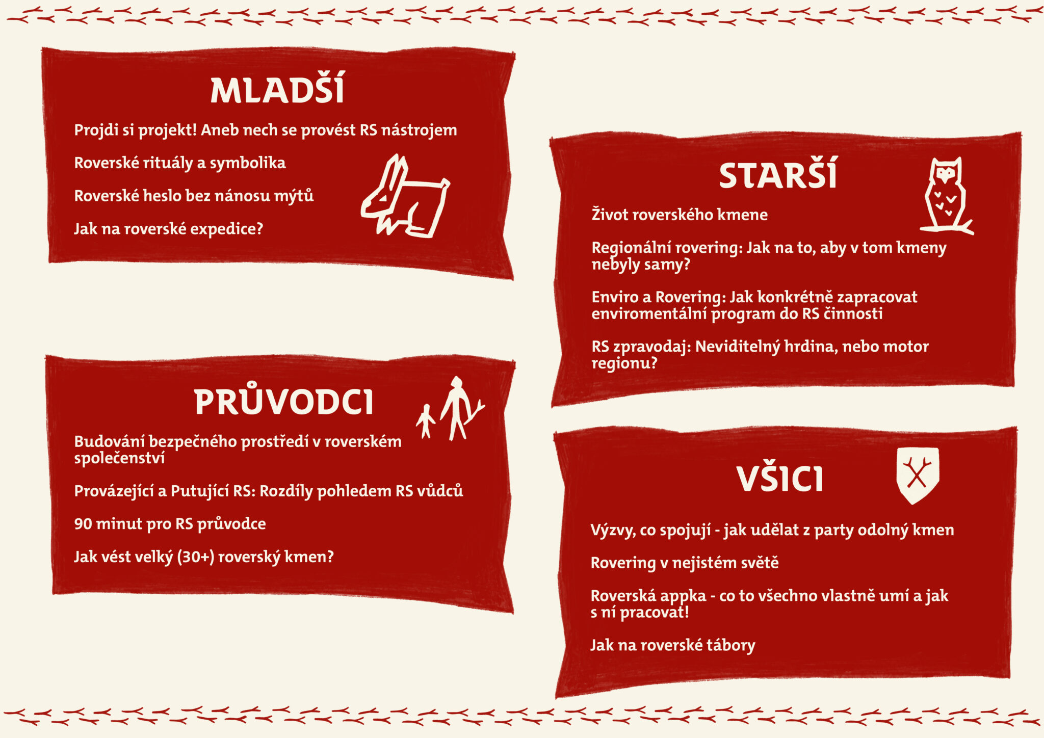 Jsou pro tebe připravené 4 linky programových bloků, tematicky řazené speciálně pro putující RS, provázející RS, RS průvodce a něco co by mohlo zajímat každého!