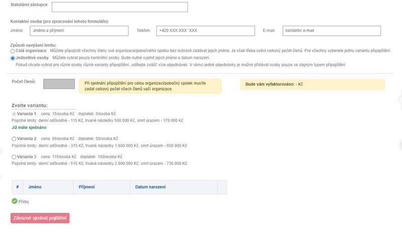 Toto připojištění (rozšiřující variantu základního úrazového pojištění) je možné sjednat přímo přes ČRDM, která zašle středisku fakturu, na následujícím odkazu.