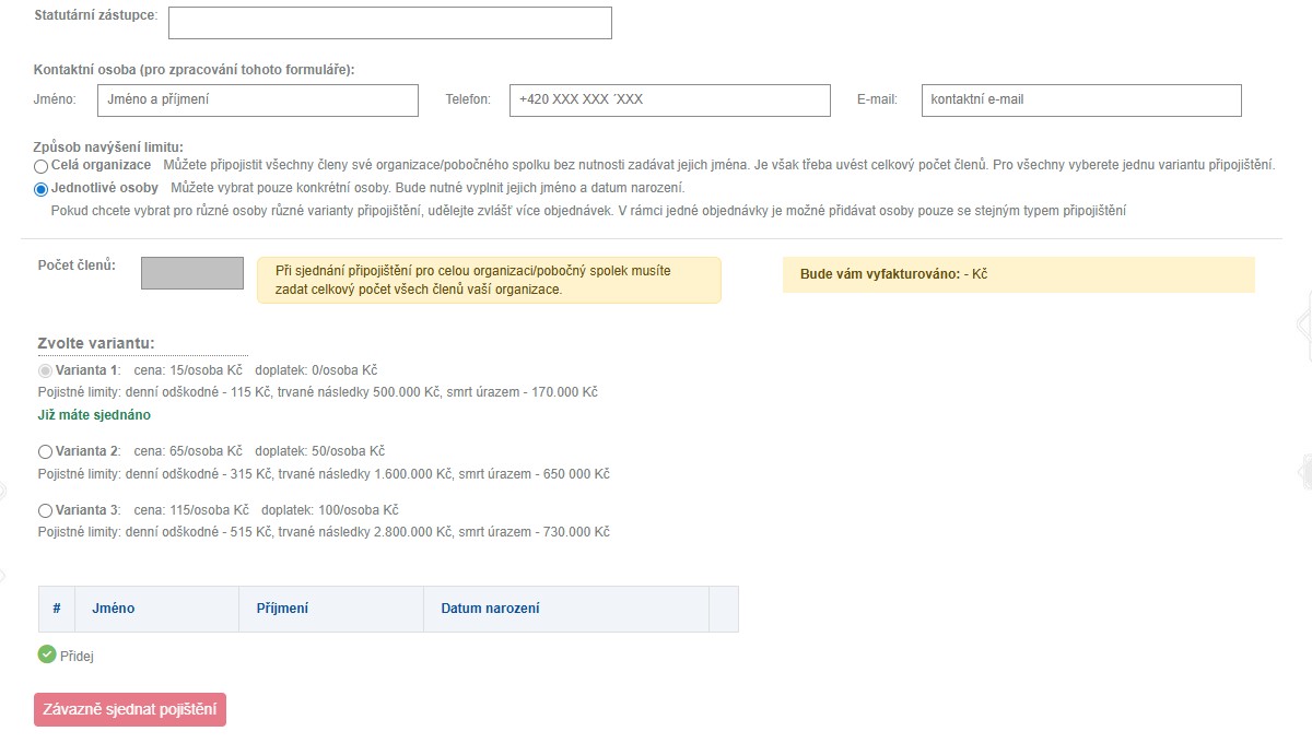 Buď pojistíte všechny členy - zadáte jejich počet, (číslo odpovídá počtu členů při zadání připojištění) nebo jen některé - zadáte jmenný seznam členů, které chcete pojistit.